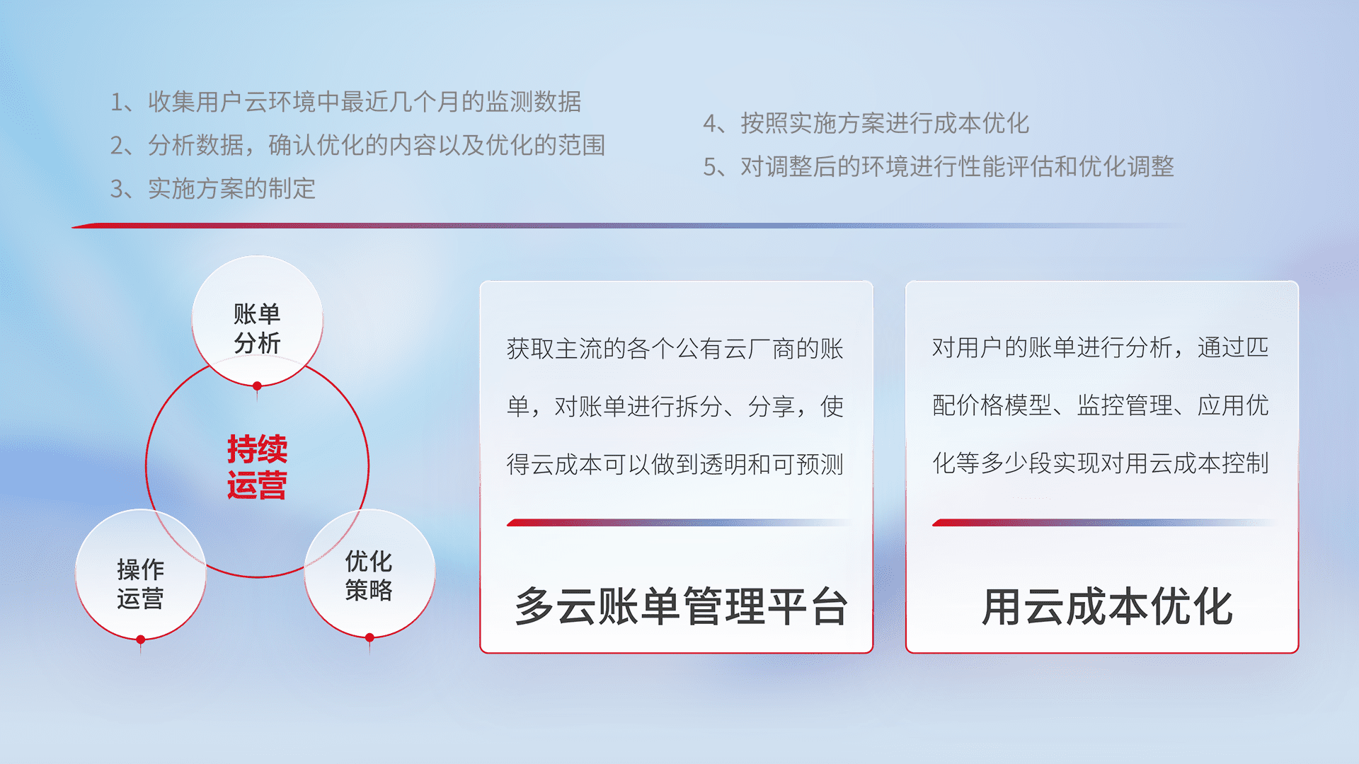 通过多云纳管,,以统一的资源数据模型把客户的云资源进行抽象和封装,,,,进而实现对多云资源的统一操作,,保障云资源管理的可靠性、、稳定性与可用性。。量身定制化运维内容,,配置、、开发运维、、补丁管理、、、备份、、、、监控、、、认证和访问管理、、、审计和日常巡检等,,,,保障在用云过程中的可靠度,,稳定度以及高可用率。。