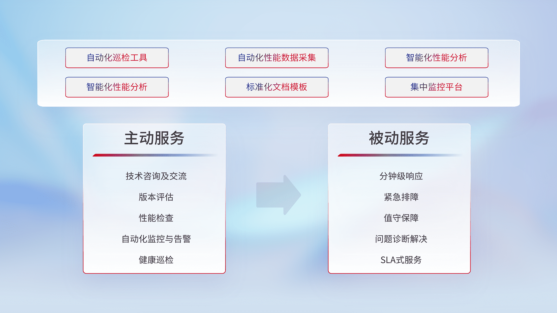 智能化工具和标准化文档,,保障服务质量,,,,提供主动服务(包含技术咨询、、版本评估、、、性能检查、、自动化监控与告警、、、健康巡检)和被动服务包含(分钟级响应、、、紧急排障、、、值守保障、、问题诊断解决、、SLA服务)。。。。